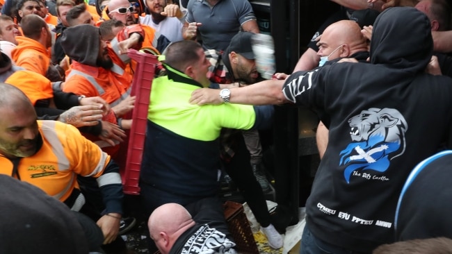 On Monday September 20 an irate crowd descended on the Victorian CFMEU offices where union secretary John Setka, attempting to placate the scene, was booed and finally attacked with bottles before retreating to safety. Union premises were smashed, and in the following days the mob took to the streets donning banners reading “Freedom” and singing the Australian national anthem.